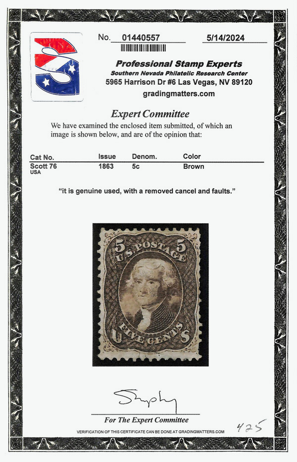 5019 O 76 image1863, 5¢ brown (Scott 76), single; Removed cancel, creased at bottom and small tear bottom., Fine, with 2024 P.S.E. certificate.