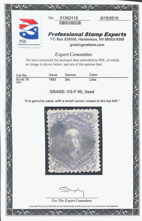 5020 O 78 image1863, 24¢ lilac (Scott 78), single; Corner crease top right., Fine to Very Fine, with 2019 P.S.E. certificate graded VG-F 60.