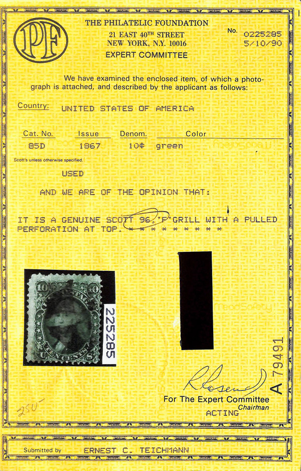 5028 O 96 image1867, 10¢ yellow green, F. grill (Scott 96), single; Pulled perf top left, Fine, with 1990 P.F. certificate.