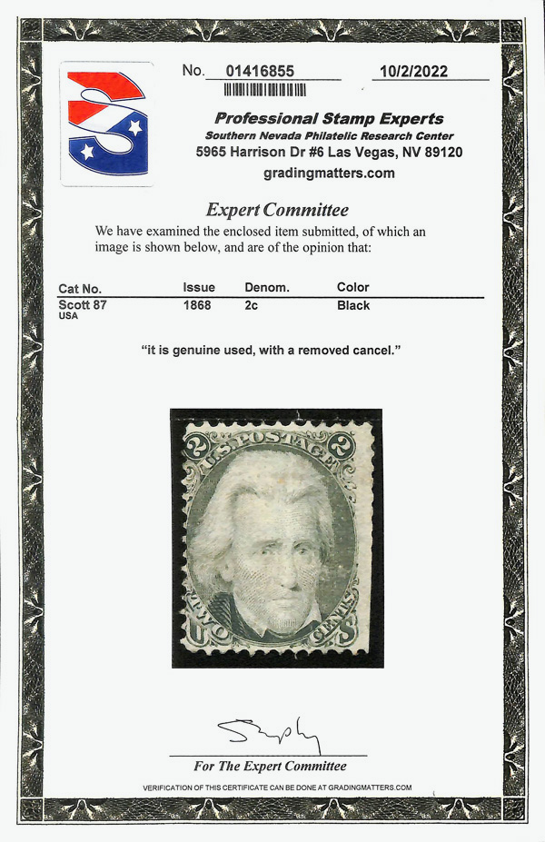 5024 O 87 image1867, 2¢ black, E. grill (Scott 87), single; Removed cancel and reperforated bottom right side., Fine, with 2022 P.S.E. certificate.