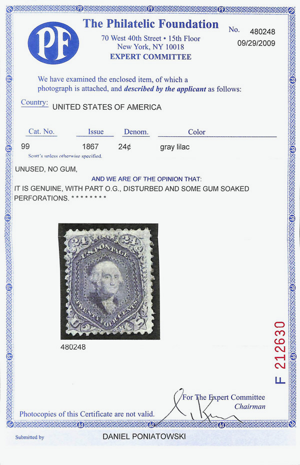 5030 og 99 image1867, 24¢ gray lilac, F. grill (Scott 99), single, part o.g., disturbed and soaked; Faulty perforations, Fine, with 2009 P.F. certificate.