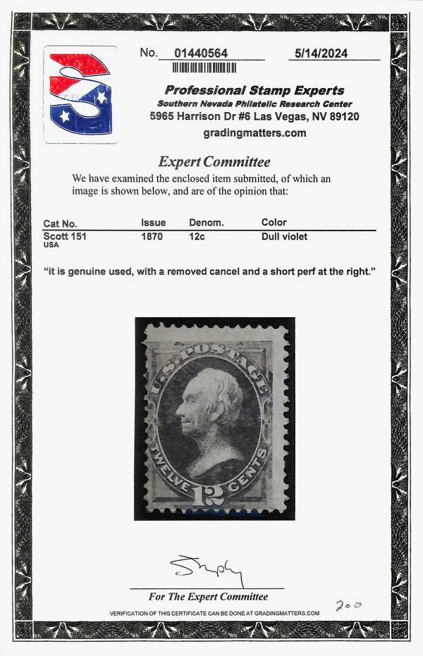 5039 O 151 image1870, 12¢ dull violet, without grill, N.B.N.C. printing (Scott 151), single; Callenation removed and short perf at right, Fine, with 2024 P.S.E. certificate.