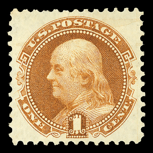 5037 og 123 image1869 (1875 Re-issue), 1¢ buff (Scott 123), o.g., hinged, attractive example with clean color and detail, all well-centered; tiny tear at top, otherwise Very Fine to Extremely Fine.