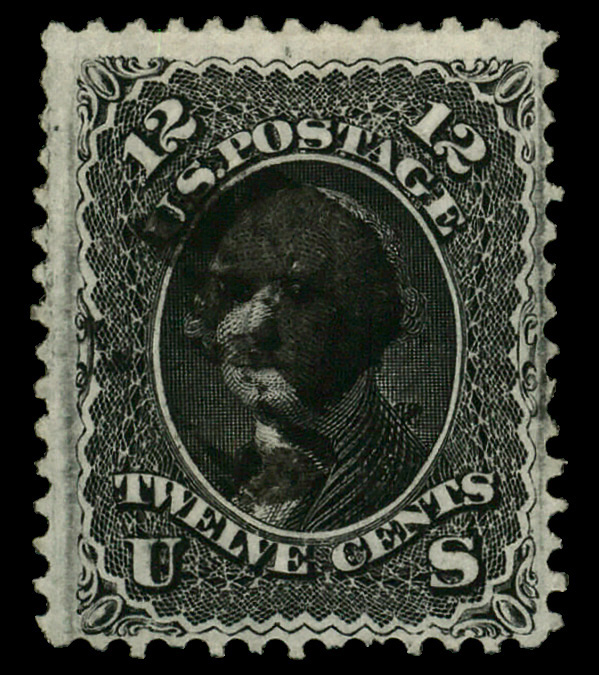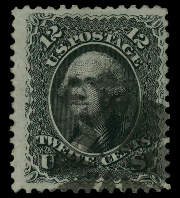 5013 O 69 image1861, 12¢ black (Scott 69), handsome centering, with a grid cancel and a red cancel; purple stains on reverse, Very Fine overall.