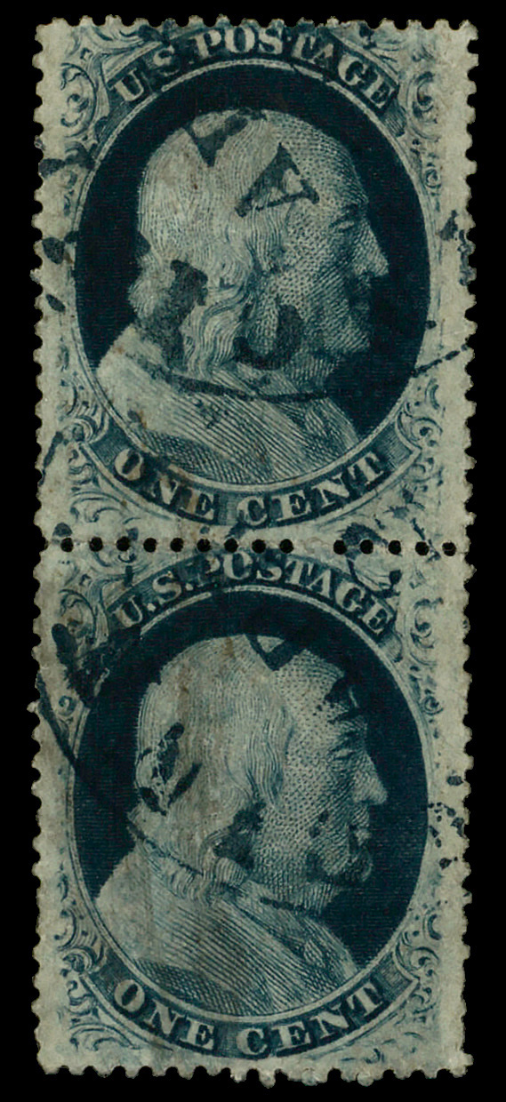 5005 O 24 image1857, 1¢ blue, type V (Scott 24), vertical pair, blue cds, Very Fine.