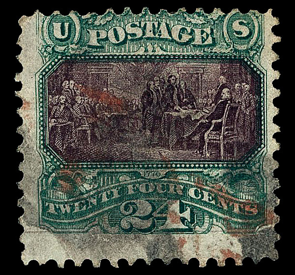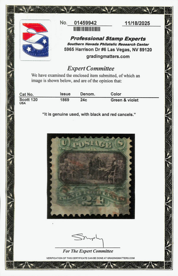 5036 O 120 image1869, 24¢ green & violet (Scott 120), red & black cancels, Very Good, with 2025 P.S.E. certificate.