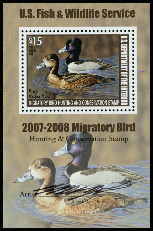 5509 nh RW74b imageHunting Permit, 2007, $15 Ring-necked Ducks, souvenir sheet of 1 (Scott RW74b), o.g., never hinged, Extremely Fine.