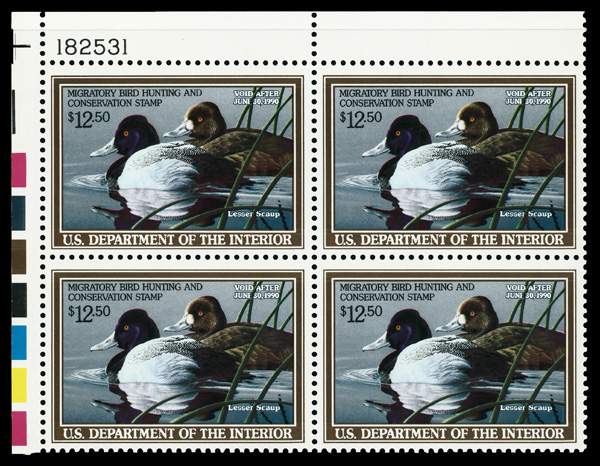 5498 nhbl RW56 imageFederal Duck Stamp, 1989, $12.50 Lesser Scaup (Scott RW56), plate block of 4, o.g., never hinged, Very Fine.