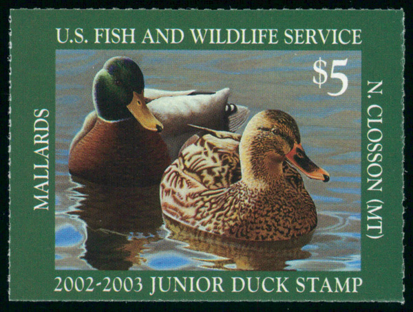 5511 nh JDS10 imageJunior Duck Stamp, 2002, $5 Mallards (Scott JDS10), o.g., never hinged, Very Fine to Extremely Fine.