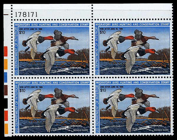 5497 nhbl RW54 imageFederal Duck Stamp, 1987, $10 Redhead Ducks (Scott RW54), plate block of 4, o.g., never hinged, Extremely Fine.