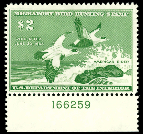 5481 nh RW24 imageFederal Duck Stamp, 1957, $2 American Eider (Scott RW24), plate number single, o.g., never hinged, Fine to Very Fine.