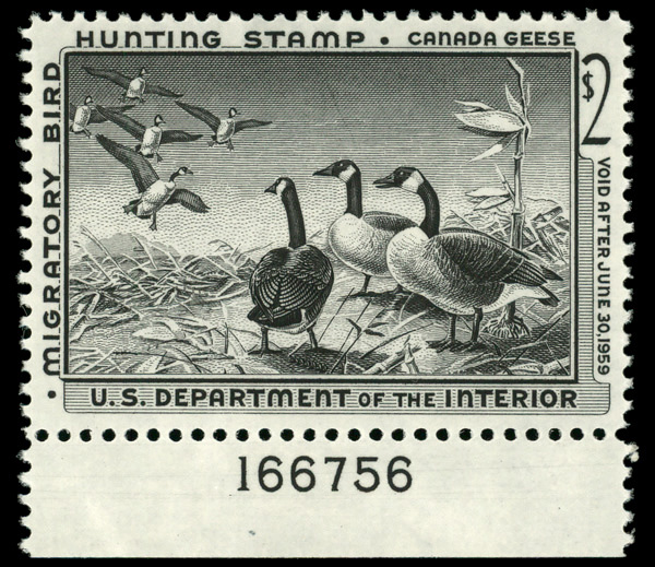 5482 nh RW25 imageFederal Duck Stamp, 1958, $2 Canada Geese (Scott RW25), plate number single, o.g., never hinged, Very Fine to Extremely Fine.