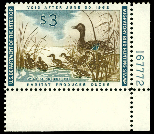 5484 nh RW28 imageFederal Duck Stamp, 1961, $3 Mallards (Scott RW28), plate number single, o.g., never hinged, Very Fine to Extremely Fine.