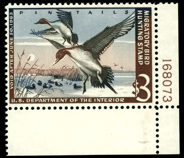 5485 nh RW29 imageFederal Duck Stamp, 1962, $3 Pintail Drakes (Scott RW29), plate number single, o.g., never hinged, Very Fine.