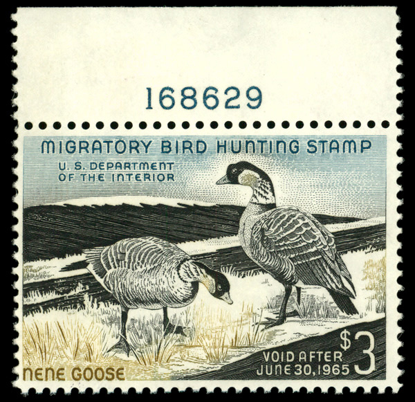 5487 nh RW31 imageFederal Duck Stamp, 1964, $3 Nene Geese (Scott RW31), plate number single, o.g., never hinged, Fine to Very Fine.