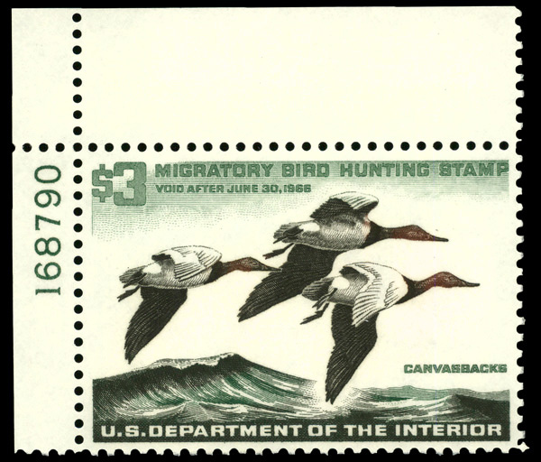 5488 nh RW32 imageFederal Duck Stamp, 1965, $3 Canvasback Drakes (Scott RW32), plate number single, o.g., never hinged, Very Fine.