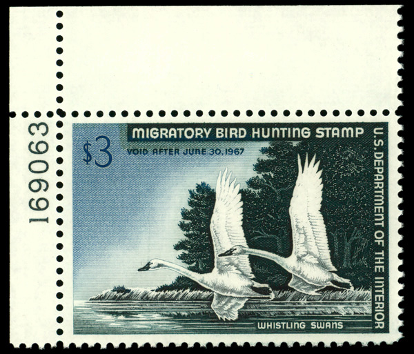 5489 nh RW33 imageFederal Duck Stamp, 1966, $3 Whistling Swans (Scott RW33), plate number single, o.g., never hinged, Very Fine to Extremely Fine.