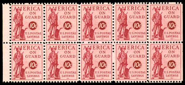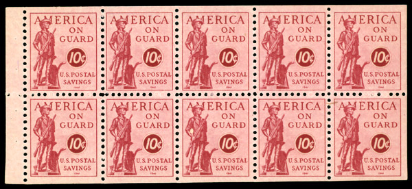 5516 BKnh PS11b imagePostal Savings, 1941, 10¢ rose red (Scott PS11b), booklet pane of 10, o.g., never hinged, Very Fine to Extremely Fine.