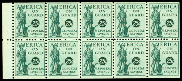 5518 BKnh PS12b imagePostal Savings, 1941, 25¢ blue green (Scott PS12b), booklet pane of 10, o.g., never hinged, Fine to Very Fine.