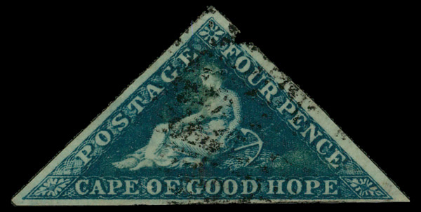 5619 O 4 image1855, Triangular, Perkins Bacon printing, 4d blue on white paper (Scott 4), single, Fine to Very Fine.