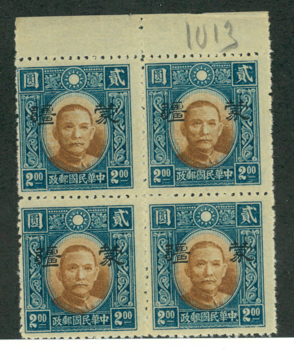 5874 nhbl 2N105 image1945, $2 deep blue & orange brown Dr. Sun Yat-sen overprinted (Scott 2N105), top margin block of 4, o.g., never hinged, Fine to Very Fine.