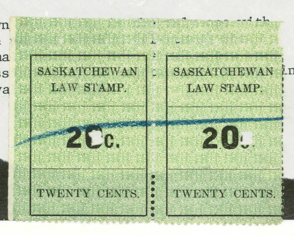 5848 O SL23 image1907, 20c black on green Saskatchewan Law stamp variety, pair, This pair has Large square dot on the first stamp and a tiny circular dot on the second stamp., Fine to Very Fine.