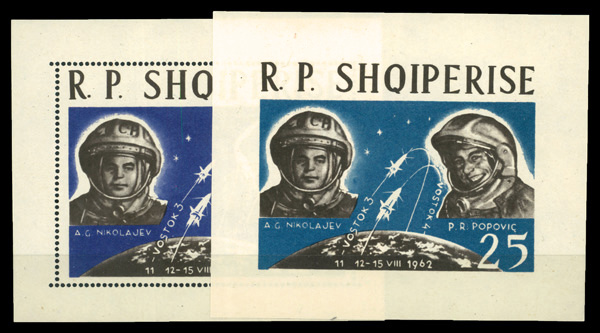 5852 nhbl 657 image1963, First group space flight of Vostoks 3 and 4, 25l violet blue & sepia and changed color 25l souvenir sheets complete (Scott 657), complete sets of souvenir sheets of 1, o.g., never hinged, Fine to Very Fine.