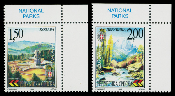 5866 nh 91-92 image1999, Europa National Parks complete (Scott 91-92), complete set of right corner margin singles, This is Bosnia & Herzegovina Serbian Administration., o.g., never hinged, Fine to Very Fine.