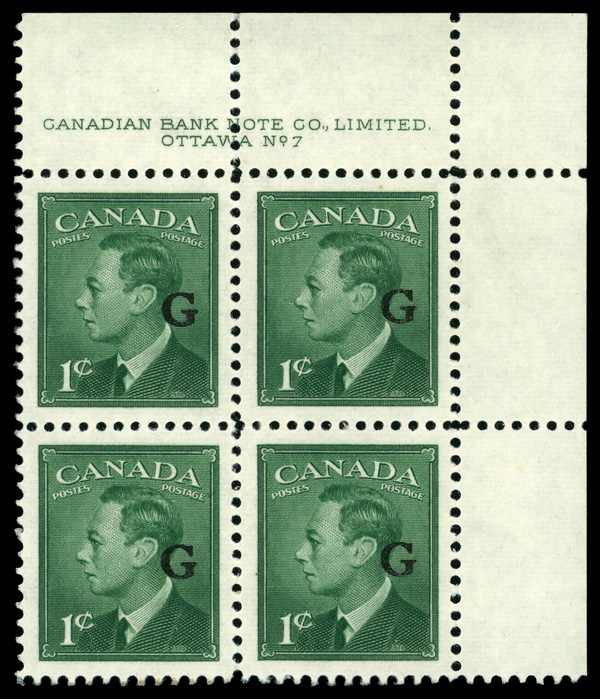 5842 nhbl O16 imageOfficial, 1950, 1¢ King George VI, "G" overprint (Unitrade O16), UR plate block of 4 plate #7, o.g., never hinged, Superb.