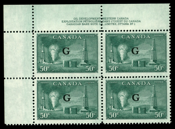 5843 nhbl O24 imageOfficial, 1950, 50¢ Oil Wells, "G" overprint (Scott O24), plate block of 4, o.g., never hinged, Very Fine.