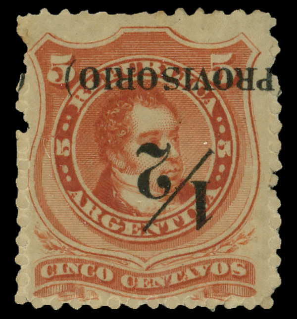5855 og 41b image1882, Rivadavia, ½c on 5c vermilion, surcharge inverted (Scott 41b), single, o.g., hinged; perforations faults, Fine.