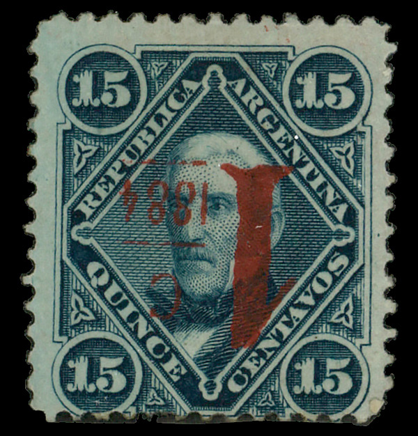 5856 og 48b image1884, 1c on 15c blue Jose de San Martin inverted surcharge in red (Scott 48b), single, disturbed o.g., Fine.