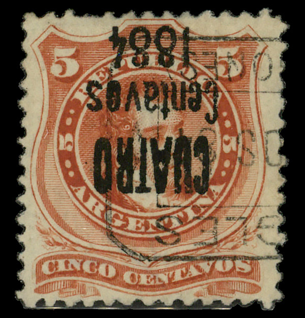 5857 O 51a image1884, 4c on 5c vermillion Rivadavia inverted surcharge in black (Scott 51a), single, Fine to Very Fine.