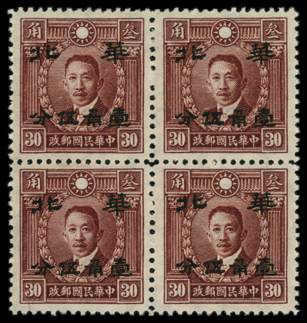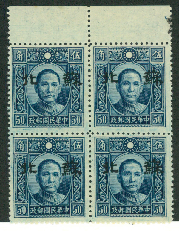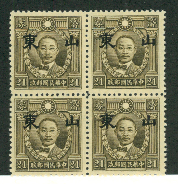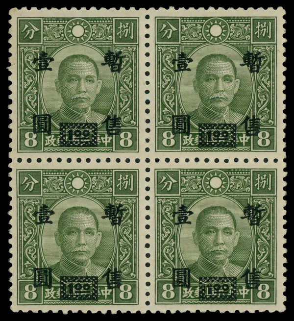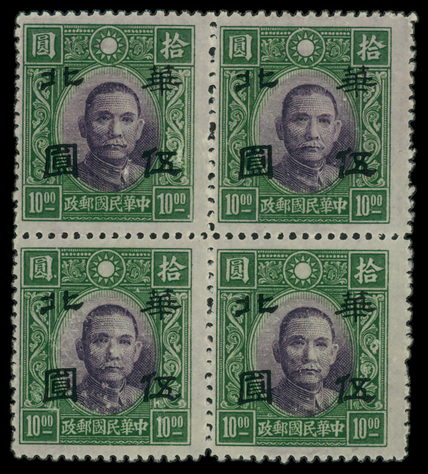 5888 nhbl 8N53 image1942, $10 dark green & dull purple Dr. Sun Yat-sen surcharge (Scott 8N53), block of 4, o.g., never hinged, Fine to Very Fine.