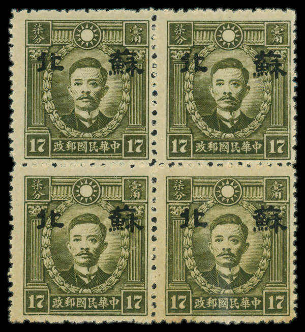 5883 nhbl 7N49a image1941, 17c brown olive Martyrs Issue Sung Chiao-jen overprinted (Scott 7N49a), block of 4, o.g., never hinged, Fine to Very Fine.