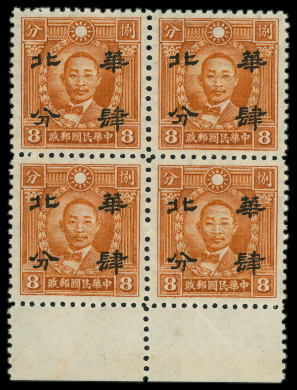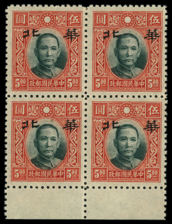 5889 nhbl 8N64 image1942, $5 red & greenish black Dr. Sun Yat-sen surcharge (Scott 8N64), bottom margin block of 4, o.g., never hinged, Fine to Very Fine.