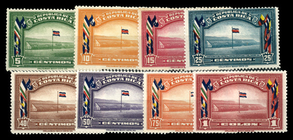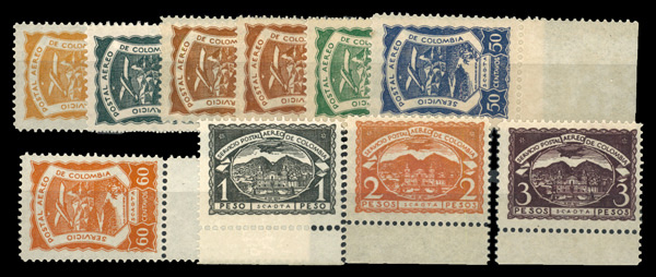 5892 nh/og C25-C34 image1921, Plane over Magdalena River and Bogota Cathedral (Scott C25-C34), singles, o.g., 8 stamps never hinged, Fine to Very Fine, Missing Scott C35, C33 and C34 have gum disturbance.