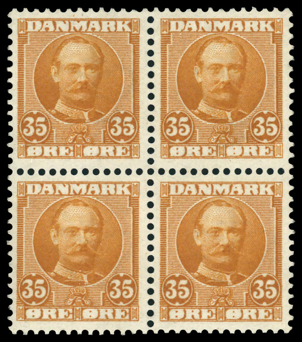 5909 nhbl 76 image1912, King Frederick VIII, 25øre deep orange (Scott 76), block of 4, o.g., never hinged, Fine to Very Fine.