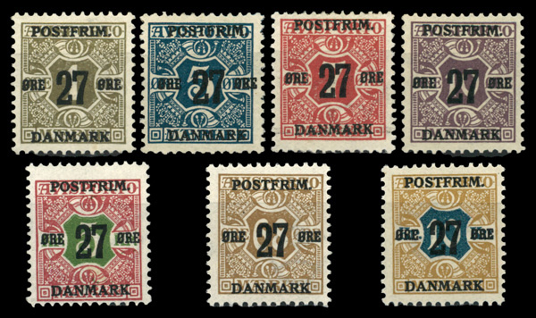 5916 og 138-144 image1918, Surcharged Newspaper Stamps, 27øre on 1ø to 1kr complete, New Crown watermark (Scott 138-144), set of 7, complete set of singles, o.g., hinged, Fine to Very Fine.