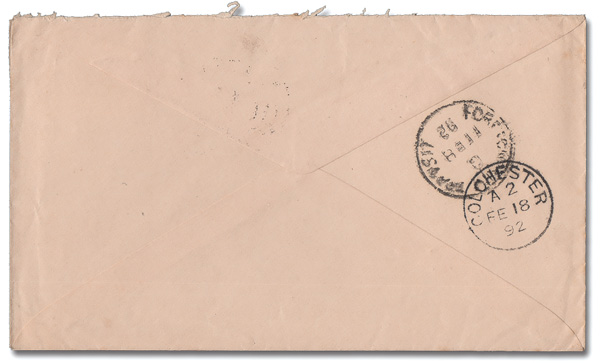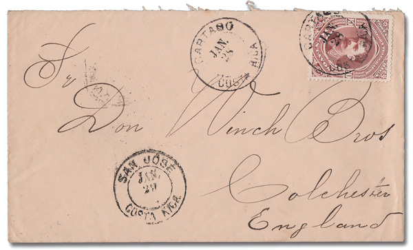 5894 cover 28 image1889, President Alfero, 10c red brown (Scott 28), tied by one of two strikes Cartago c.d.s.s, Jan 28 (1892) on a folded letter to Colchester, England. via San José (Jan 29), with "Foreign N.Y. Transit (Feb 8) and Colchester (Feb 18) backstamps, Very Fine. (Image) (Image2) (All Images)