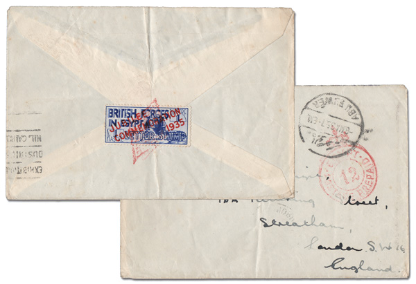 5943 cover M9 image1935, Jubilee Overprint, 1pi ultramarine (Scott M9), tied by a black "retta" on the back of a white cover, the front with a mostly complete red Crowned Circle "12" frank and an Abu Suwer c.d.s., May 8, 1935; to London; light vertical file fold through stamp, Fine.
