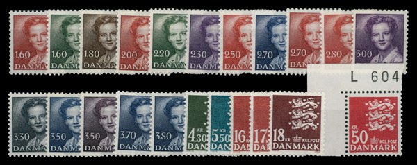 5923 nh 700-720A image1982-1985, Queen Margrethe II and Small State Seal complete (Scott 700-720A), complete set of singles, o.g., never hinged, Fine to Very Fine.
