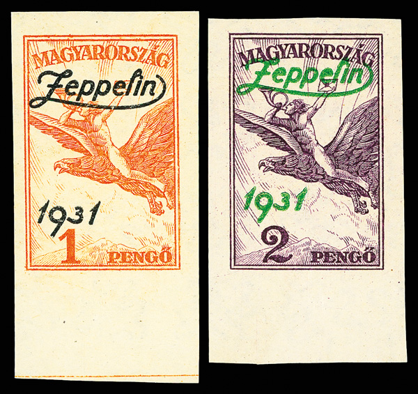 6027 nh C24-C25 imageAirmail, 1931, Zeppelin complete (Scott C24-C25), set of 2, bottom margin singles, o.g., never hinged, pristine with rich colors and massive, balanced margins, Very Fine.