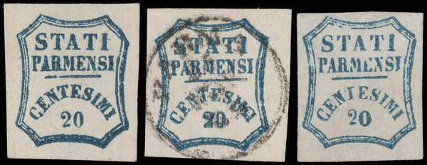 6033 og/O 14a (2), 14b image1859 Provisional Govt., two 20c deep blue and a 20c thick "0" in "20" (Scott 14a (2), 14b), all with large to oversize margins, one of the two "normal" and the thick "0" unused without gum, the other normal used, Very Fine to Extremely Fine, the two unused stamps are signed A. Brun.