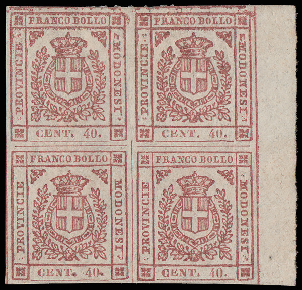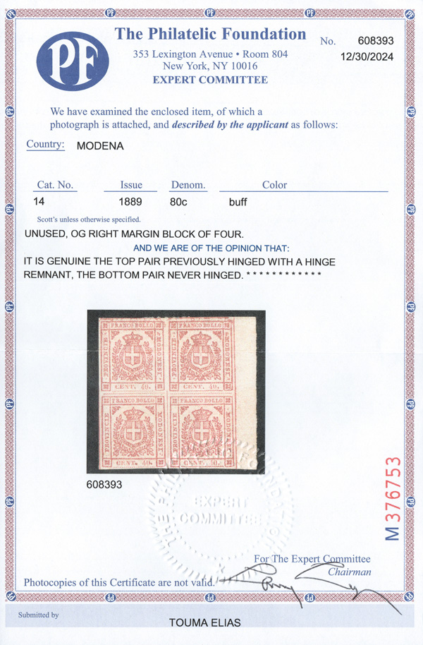 6031 nh/ogbl 14 image1859 Provisional Govt. 80c buff (Scott 14), a choice right sheet margin block of 4, o.g., hinge remnant at the top, bottom pair never hinged, bright and fresh with full margins, Very Fine to Extremely Fine, signed A. Brun, with a 2024 P.F. certificate.