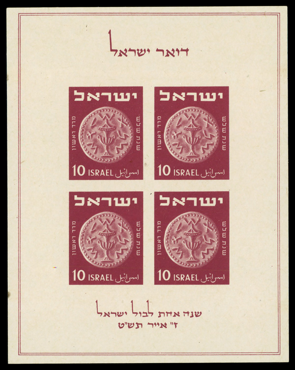 6030 nhbl 55 image1952, 1000p Menorah (Scott 55), plate block of 4, o.g., never hinged, Very Fine.