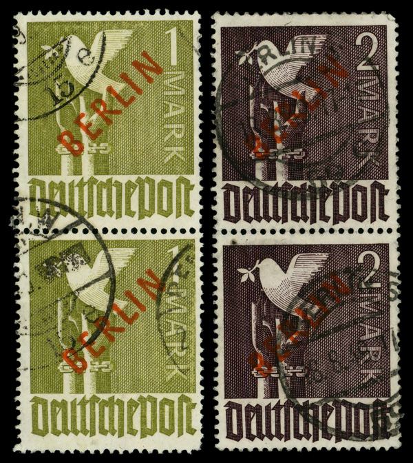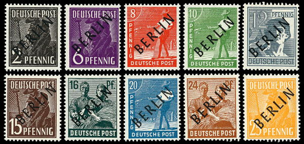 6003 cover 9N1-9N20 image1948 Black Overprints complete (Scott 9N1-9N20), on two Registered covers to Wadern, Saar, the pfennig values on one, the Mark values on the other, all tied by Berlin bridge cancels; 1M stained at lower right, others fresh and clean, Fine to Very Fine, with partial photocopy of 1978 Schlegel certificate.