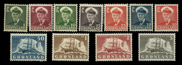6025 nh 28-35 image1950-1960, Frederik IX and Polar Ship Gustav Holm 1o - 5k complete (Scott 28-35), complete set of singles, o.g., never hinged, Fine to Very Fine.