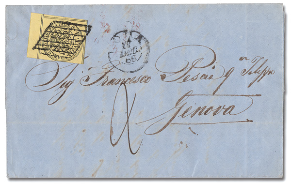 6036 cover 5 image1852, 4b black on lemon (Scott 5), a pretty sheet margin single tied on a folded letter from Rome to Genoa, Dec 17-19, 1866, Very Fine.