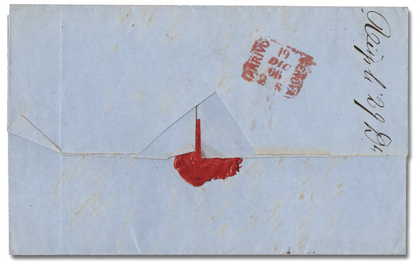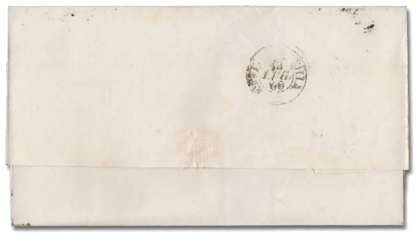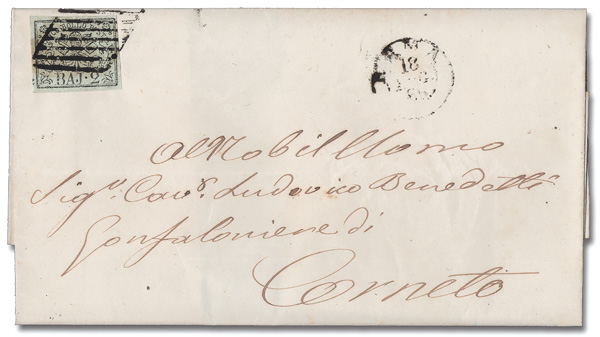 6034 cover 3 image1852, 2b black on greenish white (Scott 3), tied on a folded cover from Rome to Corneto, Aug 18, 1866, Fine to Very Fine.